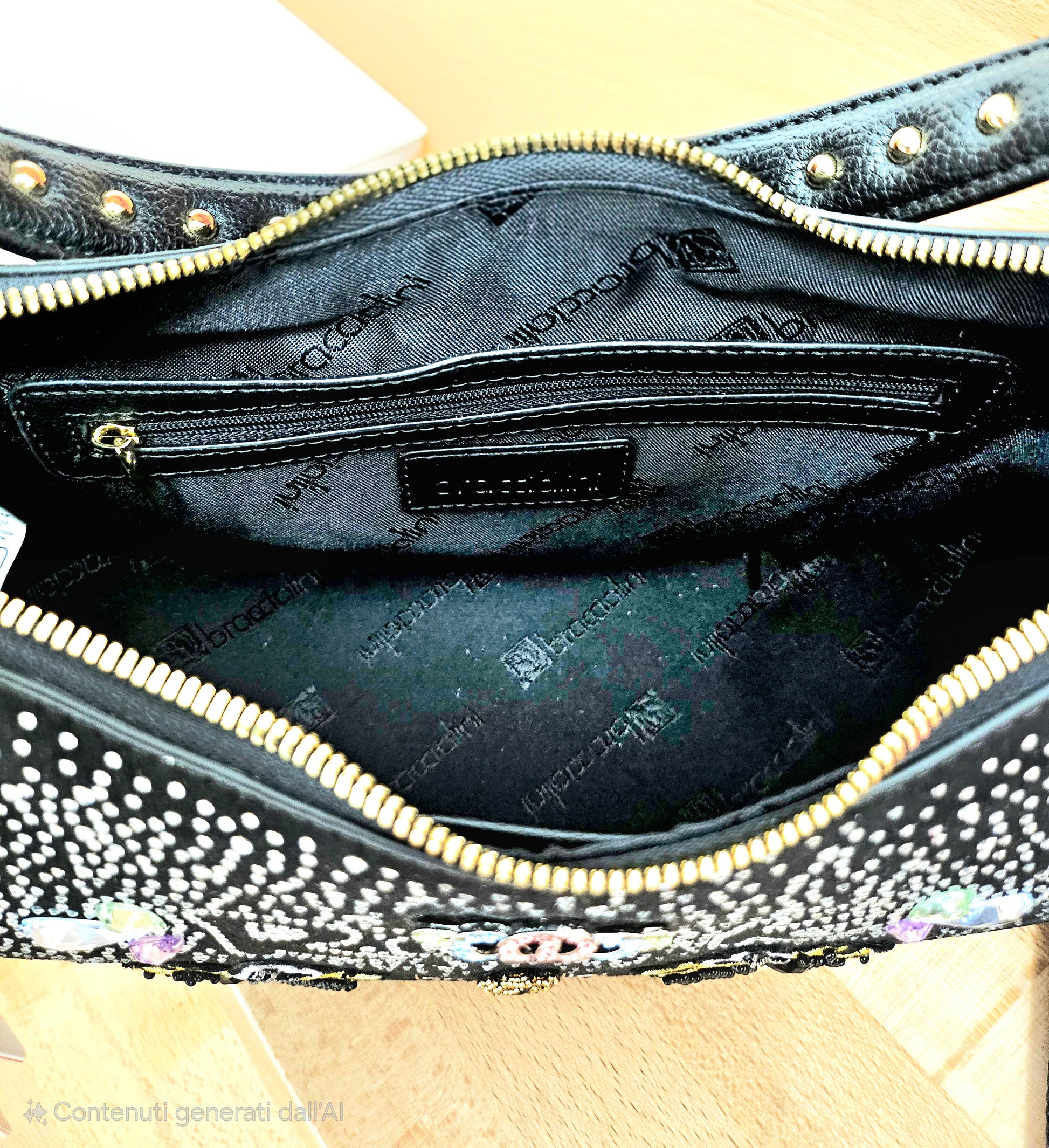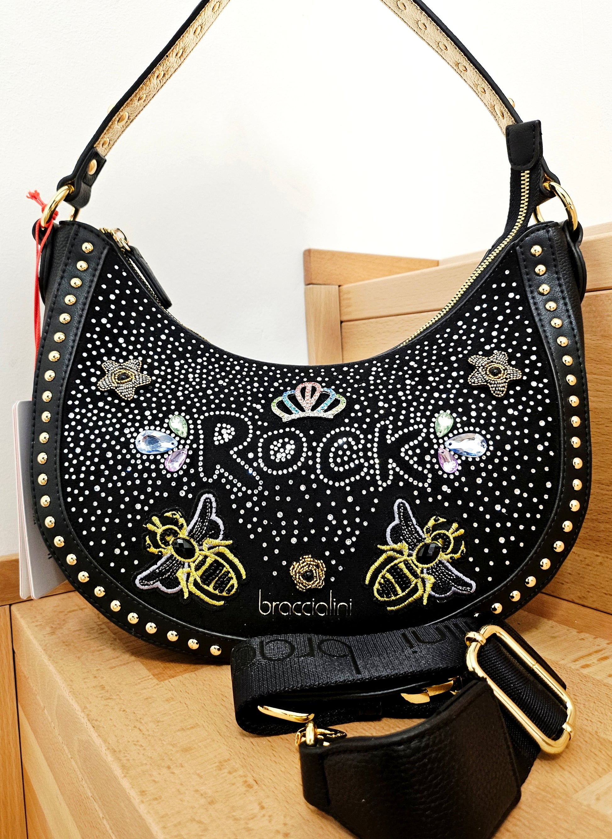 Comoda e leggera borsa con doppia tracolla in ecopelle martellata. Strass, api ricamate, pietre colorate e borchie sul fronte la rendono un pezzo unico.